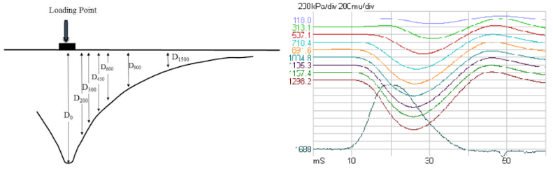 Falling Weight Deflectometers (FWD) operate by measuring and applying an impulse load to a surface. This impulse load causes a vertical deflection in the surface. The vertical deflections are measured at various distances along the load plate axis using geophones to record data. During the testing, surface temperature, air temperature, Stress, Force, and Deflections are recorded. With an integrated GPS, the coordinates and path of surveying are recorded.